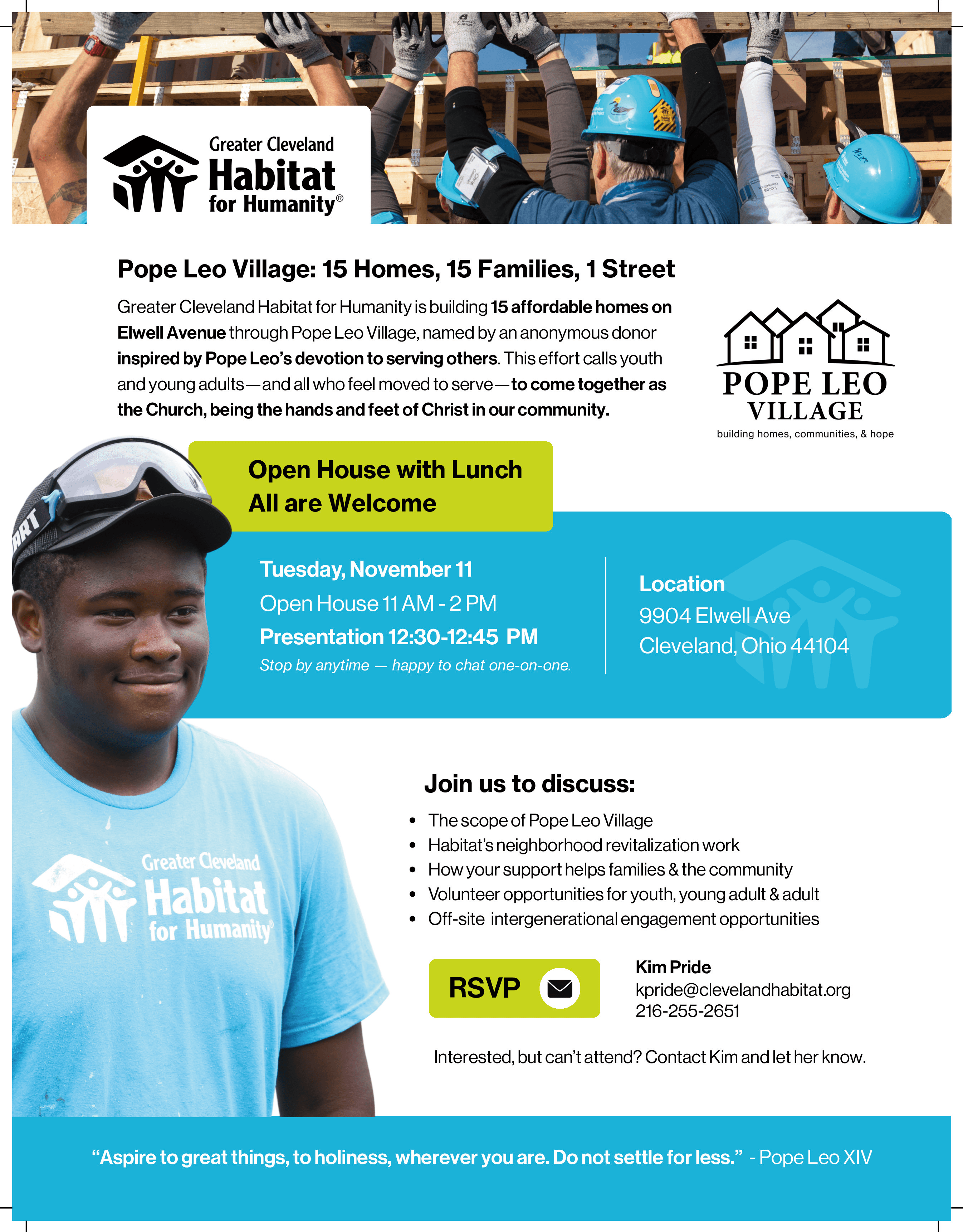 On Elwell Avenue in Cleveland’s Buckeye-Woodhill community, something special is taking shape. Pope Leo Village is underway — 15 affordable homes being built alongside families, faith partners, students, and volunteers who share a vision of stability and hope. The campaign is supported by an anonymous donor inspired by Pope Leo’s call to service and commitment to others.